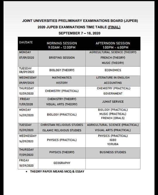 2020 JUPEB Examination Final Timetable [JUPEB Centers Nationwide]