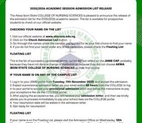 Akwa Ibom State College of Nursing Sciences (AKSCONS) has released the 2025/2026 admission list. Candidates can now verify their admission status via the college’s official […]