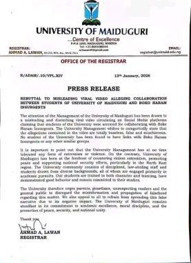 The statement, signed by the Registrar, Ahmad A. Lawan, emphasized that the University of Maiduguri has zero tolerance for extremism, violence, or any activity that threatens national security.